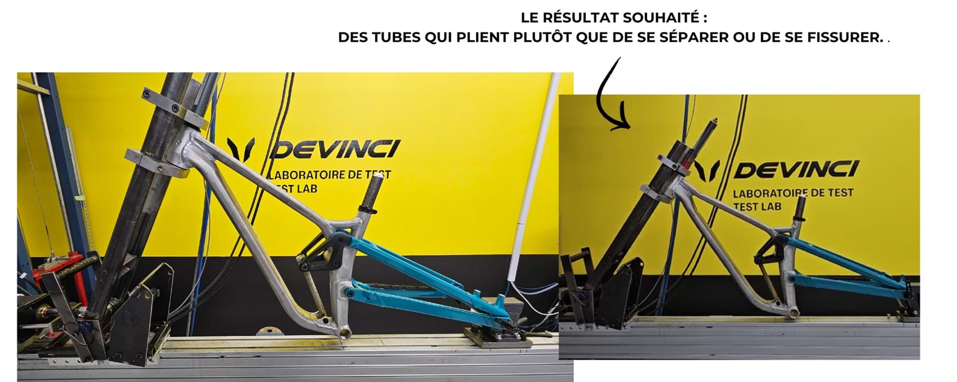 Nous avons soumis nos cadres à une batterie de tests rigoureux en laboratoire, incluant des essais de fatigue à haute intensité, des tests de séparation du tube de direction et des tests d’impact frontal avec différentes charges. Dans chacun de ces exercices, l’objectif était d’exposer le cadre à des forces bien supérieures à celles qu’un rider pourrait générer en usage normal et d’évaluer sa résistance. Ces tests visent à prévenir toute fissuration du matériel et à garantir que les soudures sont solides, durables et capables d’endurer ces charges extrêmes.