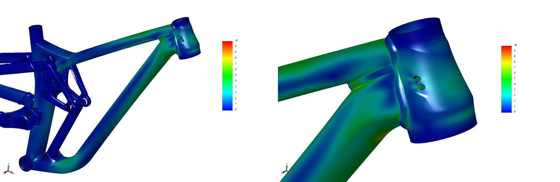 ⇧ La nouvelle version du triangle avant du Chainsaw ci-dessus est présentée dans une analyse par éléments finis. Ce procédé permet de simuler les forces et les charges appliquées sur le vélo. Les variations de couleur permettent ensuite d’identifier les sections à risque de déformation ou de fissuration du matériau.